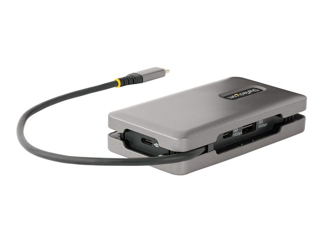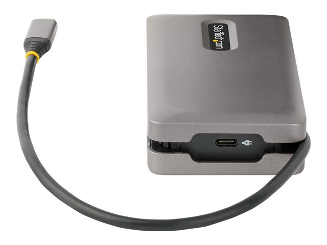 Connectez cet adaptateur multiport USB Type-C à un ordinateur portable USB-C, USB4 ou Thunderbolt 3/4 ; pour activer la sortie vidéo à écran unique HDMI 2.0b ou DisplayPort 1.4 via le mode DP Alt, prenant en charge des résolutions jusqu'à 4K 60Hz. La station d'accueil USB-C fonctionne avec les ordinateurs portables ou les tablettes USB Type-C, tels que les Chromebook, Dell XPS ou MacBook. Il est doté d'un hub USB 3.2 Gen 2 (10Gbps) à 3 ports (2x USB-A, 1x USB-C) et d'un port Gigabit Ethernet. Connectez l'alimentation USB-C de l'ordinateur portable au port USB Power Delivery (PD) 3.0 dédié, pour charger l'ordinateur portable.