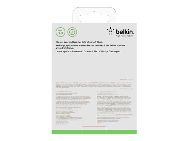RECHARGEZ ET SYNCHRONISEZ VOS APPAREILS L'adaptateur USB-C vers USB-A de Belkin vous permet de recharger votre appareil compatible USB-C, mais aussi de synchroniser vos photos, votre musique et vos données sur votre ordinateur portable existant à des débits de 480 Mbit/s. De plus, ce câble prend également en charge des intensités en sortie jusqu'à 3 A pour recharger des appareils compatibles USB-C. Conçu pour : connecter un appareil compatible USB-A standard à un appareil compatible USB-C (également dénommé USB Type-C) ALIMENTEZ ET RECHARGEZ D'AUTRES APPAREILS Ce câble USB-C prend en charge les intensités en sortie jusqu'à 3 A pour recharger et alimenter des appareils compatibles USB-C. CONNECTEUR USB-C RÉVERSIBLE Ne vous souciez plus jamais du sens de branchement. L'USB C est un nouveau connecteur intuitif et réversible qui vous permet de connecter le câble à votre appareil dans n'importe quel sens. Certification USB-IF La conformité USB SuperSpeed signifie que l'USB-IF certifie que ce câble est conforme à toutes les normes électriques, mécaniques et environnementales en vigueur, afin d'améliorer l'expérience des utilisateurs. L'USB-IF est une organisation à but non lucratif regroupant des sociétés qui facilitent le développement de produits USB de grande qualité et de tests de conformité. CONSTRUCTION DU CÂBLE USB-C DE QUALITÉ SUPÉRIEURE Blindage métallique soudé avec précision pour protéger le circuit imprimé. Il permet également de réduire les niveaux de radiations émises tout en renforçant la résistance mécanique. CE CÂBLE EST IDÉAL POUR : iPhone iPad iPod Clé USB Clavier Souris En bref : Connectez des appareils compatibles USB-C (nouveaux Macbook, Chromebook Pixel) à des appareils et périphériques compatibles USB-A (clés USB, clavier, souris) Connecteur USB-C réversible Puissance de sortie de 3 A Vitesse de transfert pouvant atteindre 5 Gbit/s Contenu de l'emballage : Adaptateur USB-C 3.0 vers USB-A.