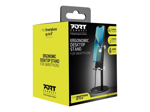 Le support de bureau ergonomique PORT Connect 901109 pour smartphones est parfait pour les plus grands appareils jusqu'à 8". Idéal pour les appels vidéo, le chat et l'utilisation quotidienne, il permet de positionner l'appareil en mode vidéo ou portrait. Sa conception à hauteur des yeux prévient les troubles musculo-squelettiques. La hauteur et l'angle de vue sont entièrement réglables pour une position de visionnement optimale. Ce support mains libres est conçu pour une utilisation sur le bureau. Optimisez l'espace de travail grâce à son design ergonomique et à la gestion des câbles. Son corps en aluminium robuste est ultra résistant et permet la dissipation de la chaleur de l'appareil.