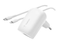 Description du produit Belkin BOOST CHARGE adaptateur secteur - technologie PPS - 24 pin USB-C - 30 Watt Type de Produit Adaptateur secteur Couleur Blanc Type de prise 24 pin USB-C Courant électrique max. 3 A Technologie de charge rapide Power Delivery 3.0 Alimentation fournie 30 Watt Câbles Câble USB-C vers Lightning - 1 m Garantie du fabricant Garantie de 2 ans -